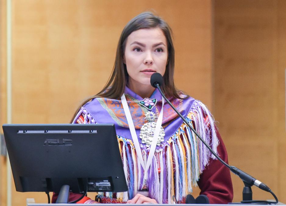 Saami Council delegate Rosa-Marén Magga welcomes representatives to Rovaniemi. (Photo: Arctic Council Secretariat/ Linnea Nordström)