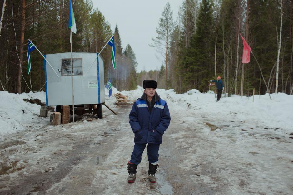 Heavy timber logs lie across the narrow forest road. Shigaryev is adequately dressed for the Russian winter; a thick fur hat and large boots allow him and the rest of the crew at this road post to keep the cold out during their 12 hour-long shifts.