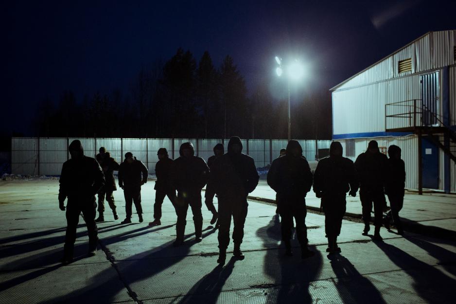The area is still officially defined as forest in public registries. And conservationists therefore use their right, rooted in the Russian constitution, to freely roam the woods – even if the woods we walk are not made of clay or sand, but concrete. Our attempt to enter one of the barracks is efficiently interrupted when the tall men in black stand together to form a wall before the activists.