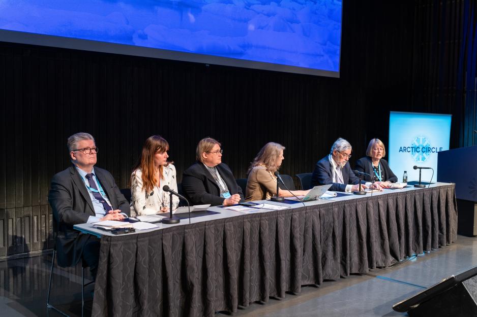 The panel of the Arctic Circle Assembly session titled "The Future of Polar Science Diplomacy: A Critical Mission in Uncertain Times." From the left: Petteri Vuorimäki, Senior Arctic Official & Ambassador of Arctic Affairs, Ministry for Foreign Affairs of Finland; Salomé Mormentyn, Polar Initiative Manager; Gerlis Fugmann, Executive Secretary, International Arctic Science Committee (IASC); Margaret D. Williams, Senior Fellow, Arctic Initiative, Belfer Centre; John P. Holdren, Research Professor & Co-Director of the Science, Technology, and Public Policy Program, Belfer Center and Jane Francis, Director, British Antarctic Survey. (Photo: the Arctic Circle Assembly)