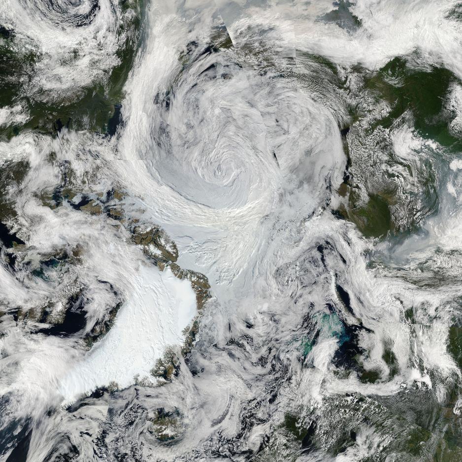 Due to continued warming, more extreme events like this storm could develop over the Arctic in the future. (Photo Credit: NASA Goddard Space Flight Center from Greenbelt, MD, USA (Summer Storm Spins Over Arctic) [CC BY 2.0 (http://creativecommons.org/licenses/by/2.0)], via Wikimedia Commons)