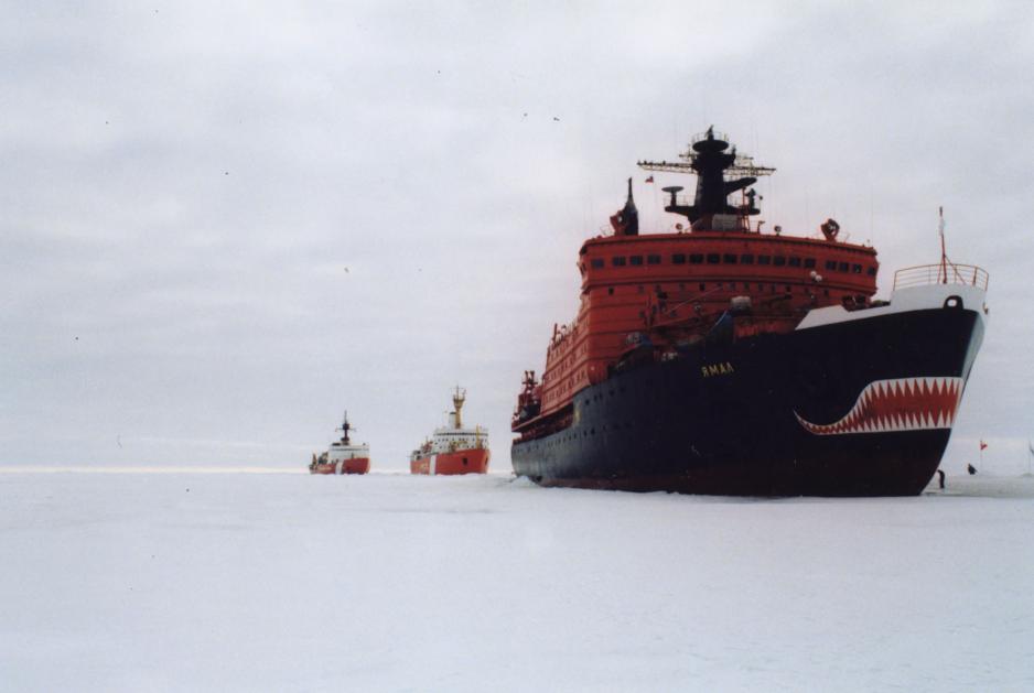 The russian icebreaker "Yamal" of the Arktica class in the lead, followed by the CCG Louis St. Laurent and the USCG Polar Sea. Photo: LCDR Steve Wheeler/United States Department of Homeland Security