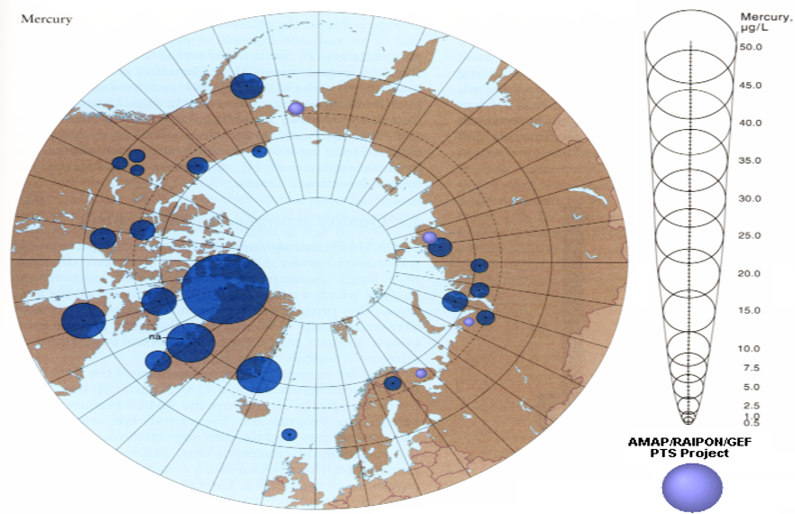 The illustration shows where researchers have found the highest levels of mercury in pregnant women. (Source: AMAP)