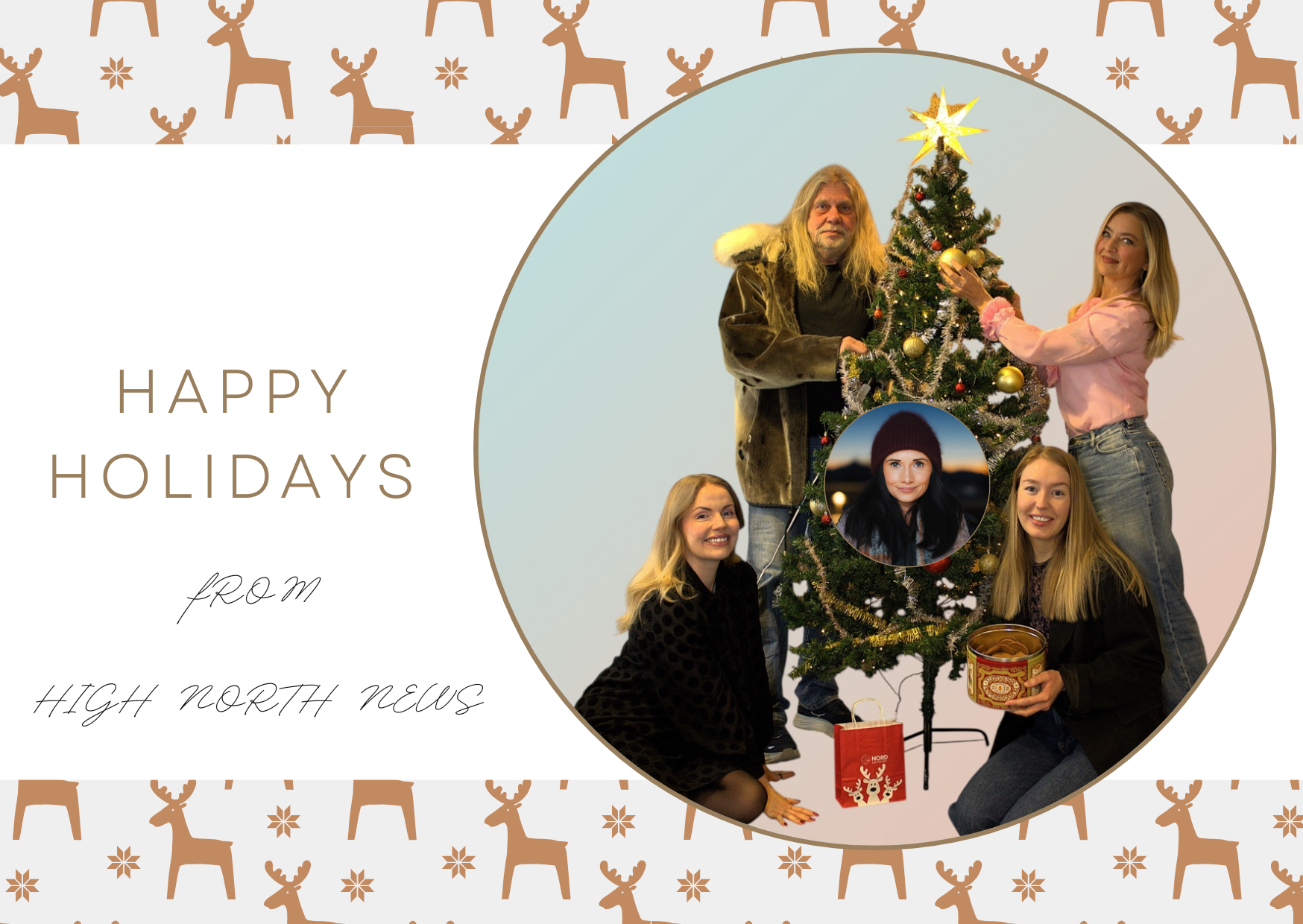 Happy Holidays from the editorial team: Commentator Arne O. Holm (top left), editor-in-chief Trine Jonassen (top right), research journalist and translator Birgitte Annie Hansen (bottom left), journalist Astri Edvardsen (in the tree) and journalist Hilde Bye (bottom right). (Photo: Markus J. Thonhaugen, High North Center/Private)