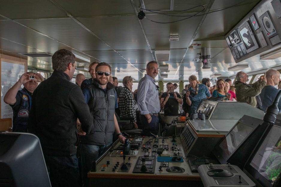 MOSAiC Team members celebrating on the bridge of the Polarstern after reaching the North Pole. (Source: Courtesy Lianna Nixon)