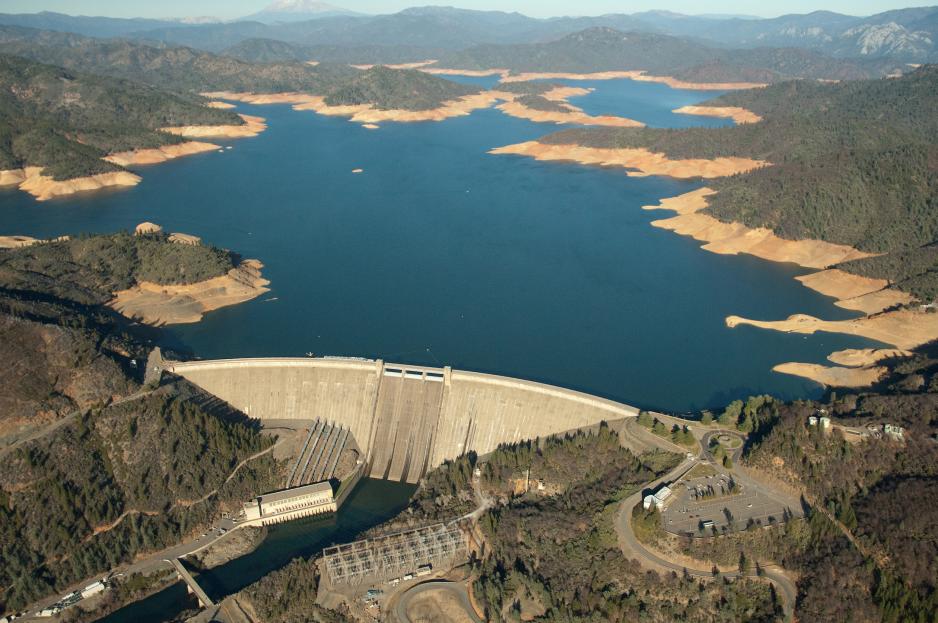 Aerial view of low water level in drought conditions at Lake Shasta in California, 2014. DWR (Department of Water Resources), California.
