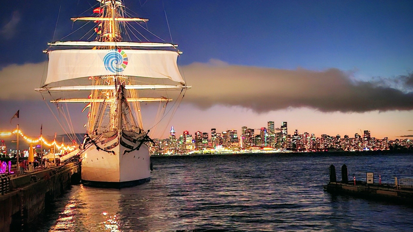 Statsraad Lehmkuhl at the quay with downtown Vancouver as a backdrop. Credits: Roberto Rivas Hermann