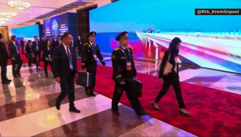 Behind Putin comes naval officers with what is said to be nuclear briefcases. (Screenshot of video from the Russian state news agency RIA on X)