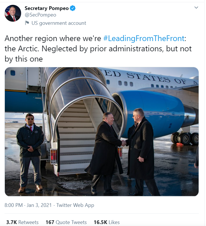 In several Twitter posts, Mike Pompeo looks back on his term as Secretary of State, highlighting US achievements in the Arctic. However, several reactions awaited Pompeo's own take on his leadership in the region during his tenure.