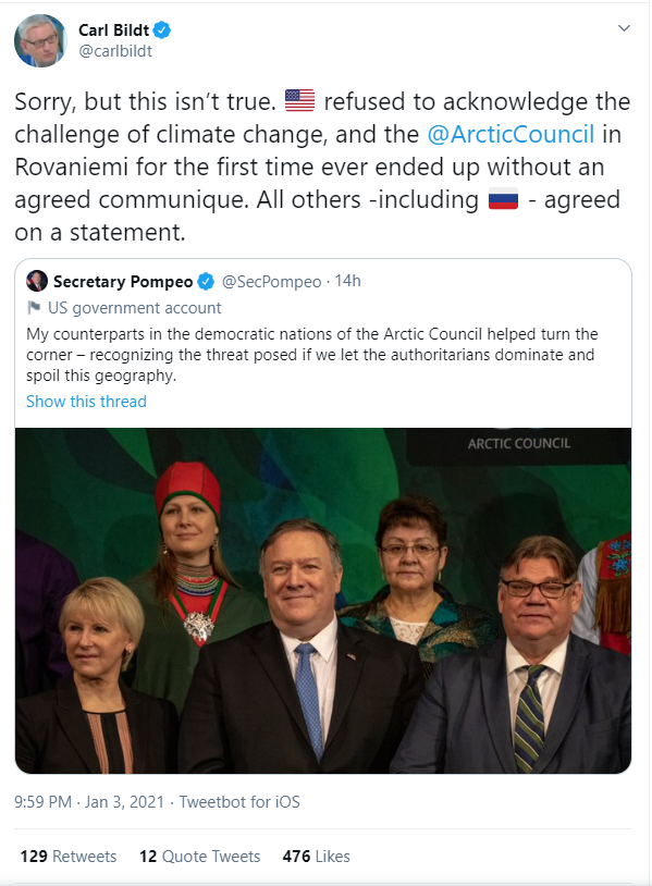 Former Swedish prime minister and foreign minister Carl Bildt also responded to Pompeo's tweet on the 2019 Arctic Council Ministerial Meeting.