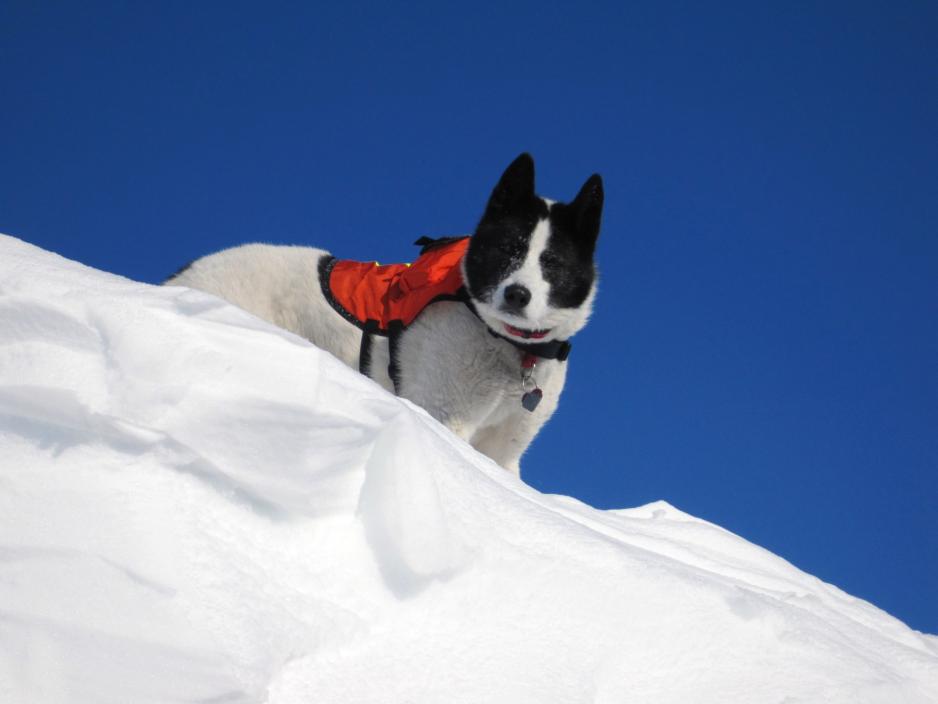 In 2009, Perham partnered with Dick Shideler of Alaska Fish and Game to bring in Shideler’s two Karelian bear dogs, Kavik and Riley, so that they could study the efficacy of dogs in detecting polar bear dens. Karelians, a Russian and Finnish breed, have long been used to chase off problem bears in the Lower 48, and they’re hardy enough for an Arctic climate, able to cover 8–16 km (5-10 miles) each day.