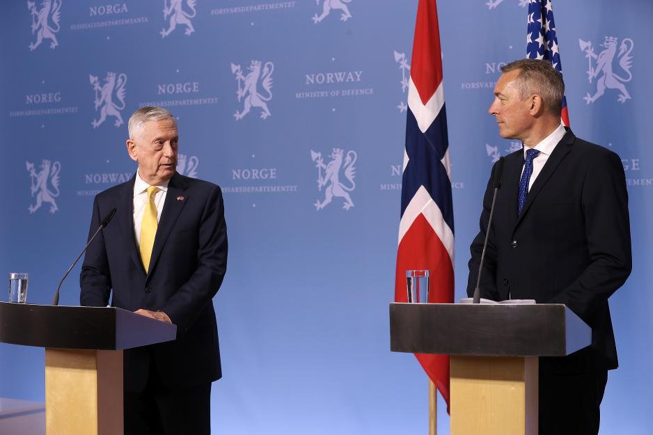 The US' increased focus on unpredictability may complicate Norway's reassurance policy towards Russia, researchers explain. (From left: United States Secretary of Defence James N. Mattis and Norwegian Minister of Defence Frank Bakke-Jensen during a press statement at the Norwegian MoD, July 2018. Photo: Torbjørn Kjosvold / Forsvaret).