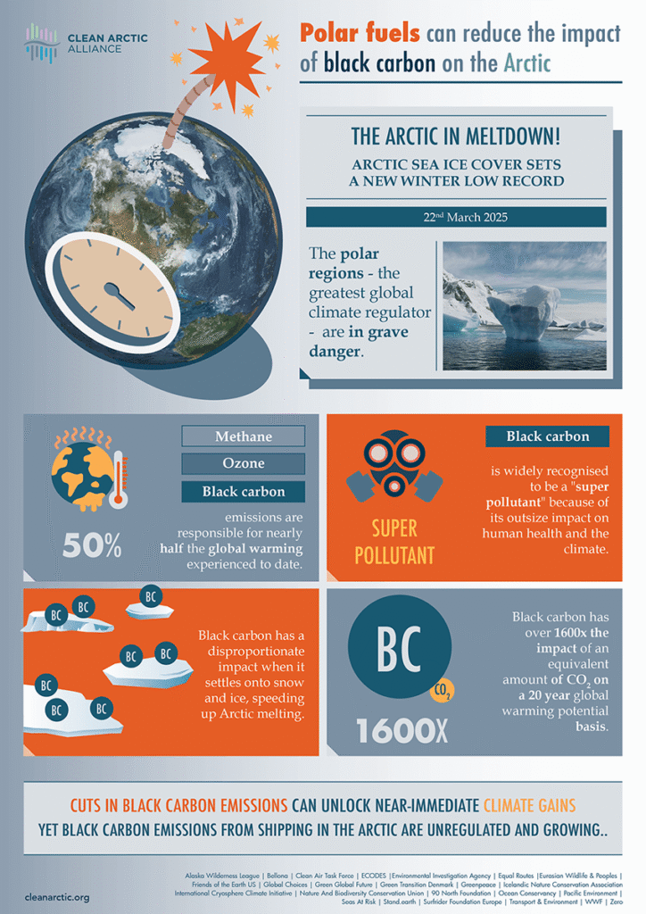 Infographic describing what polar fuels are and how they can reduce the impact of black carbon on the Arctic. (Source: Clean Arctic Alliance)