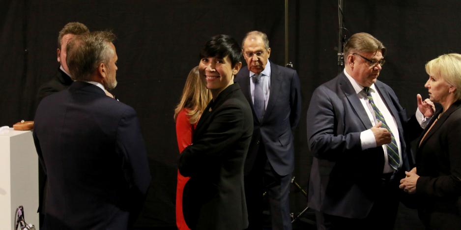Utenriksminister Ine Eriksen Søreide fotografert under ministermøtet i Arktisk Råd i Rovaniemi i mai 2019. Her sammen sine finske, amerikanske og russiske kolleger. Foto: Arne O. Holm