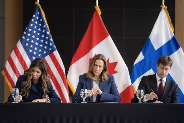 Homeland Security Secretary Kristi Noem, Canadian Ambassador to the United States Kristen Hillman and Finnish Minister of Economic Affairs Sakari Puisto signing a Joint Statement of Intent. (Source: DHS)