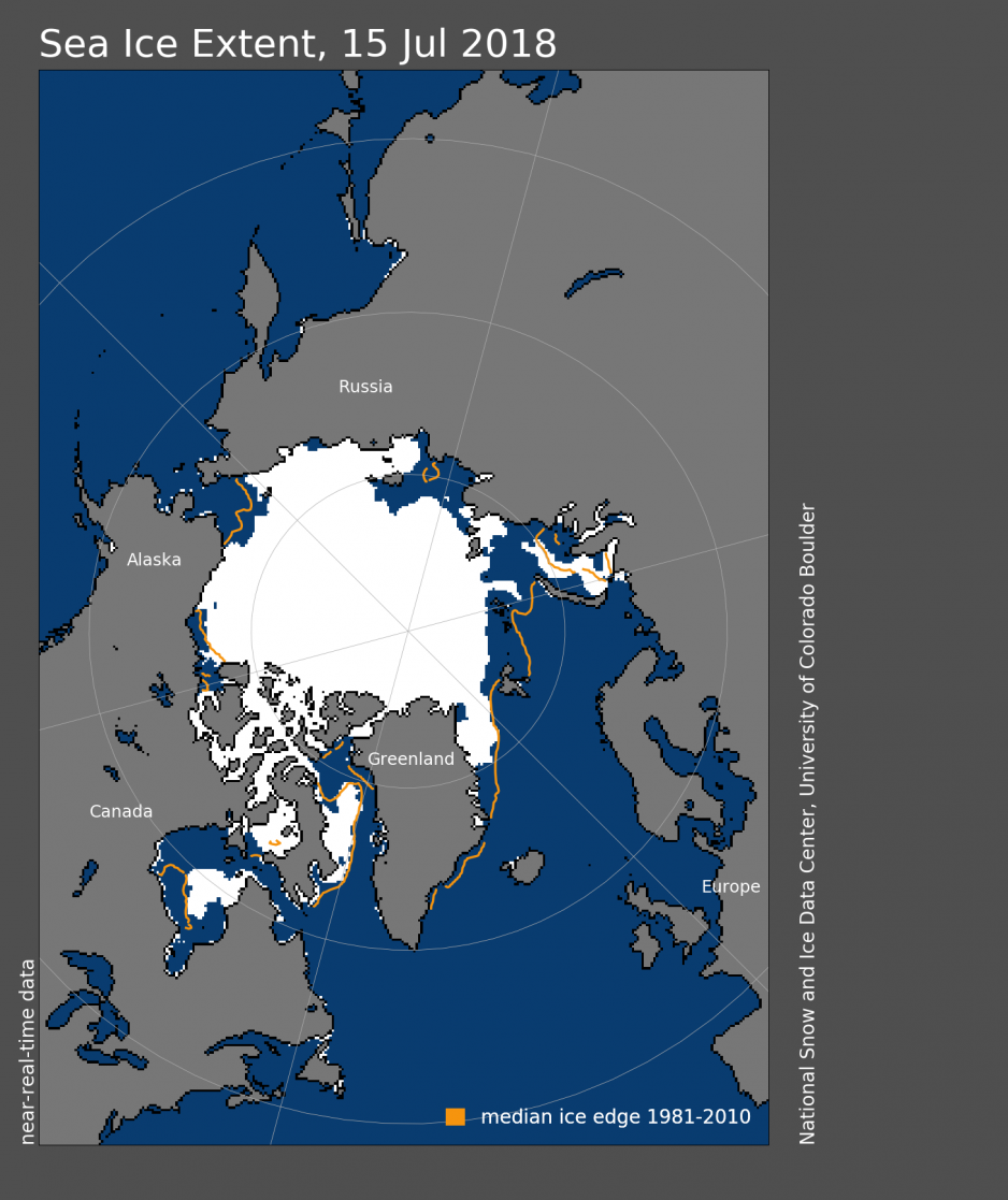 In mid-July, Arctic ice extent was at 8.5 million square kilometres. While still below the 1981-2010 average, it is also 670,000 square kilometers above the record low from 2011. Although total Arctic sea ice extent was tracking at record low levels during winter, and although heat warnings have been issued for parts of the Arctic like in Finnish Lapland and massive forest fires rage (also in Northern) Sweden, the rate of summer ice loss thus far shows no signs of a new record minimum. Most ice has melted in the Kara Sea while in the Beaufort Sea, the ice edge has even expanded slightly southwards, according to the NSIDC.