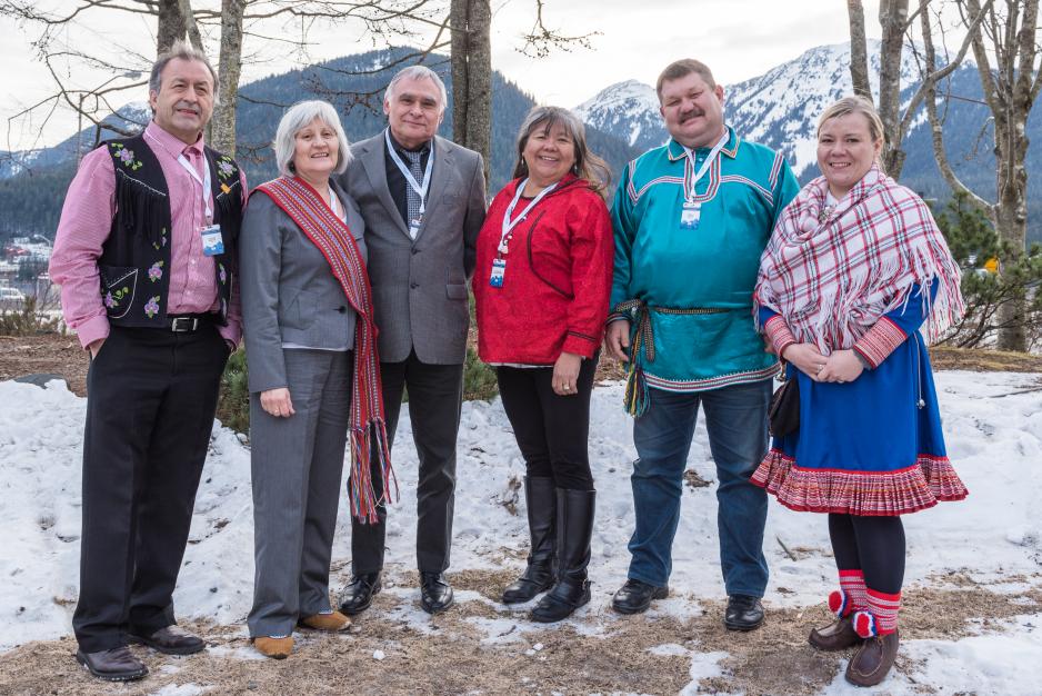 Heads of Delegation for the six Indigenous Permanent Participant organizations at the Senior Arctic Officials' meeting in Juneau, 2017 (Arctic Council Secretariat / Linnea Nordström)