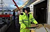 Kasse på kasse med hyse lastes opp på kaia, der den kjøres bort med truck inn på mottaket.