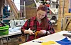 Det knatrar frå ei symaskin i 2. etasje i kunstnarsenteret dagen før utstillingsopninga. Julia Lytvynova sit bøygd over eit lite gult hjarte. Til det syr ho fast eit mindre blått hjarte. På baksida skal ho sette ei nål. Hjarta, og armband ho har fletta, skal seljast til inntekt for humanitært arbeid i heimlandet Ukraina.