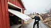 Brannsjef Tor Inge Olaussen, står ved en rød garasje med hvit port. Malingen flasser av og treverket er råttent.