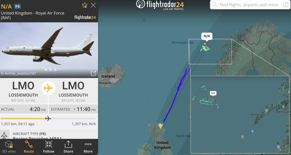Flydata viser at flere P-8-fly tok av fra Lossiemouth i Skottland og Reykjavik på Island, og reiste til farvannene utenfor Lofoten, hvor de sirklet i timevis før de returnerte til basene sine eller landet i Norge.