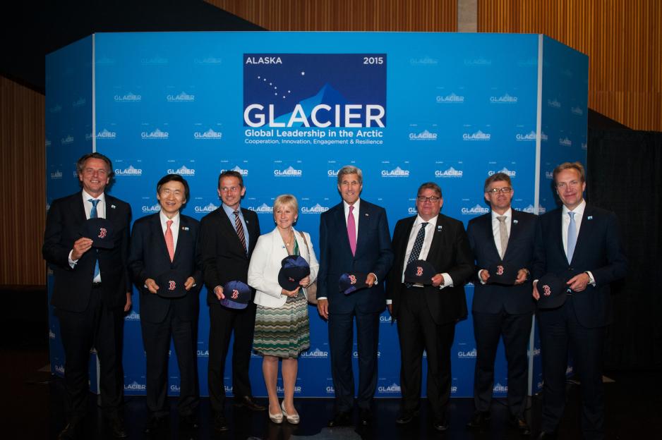 Utenriksminister John Kerry samlet sine kolleger til ære for fotografene under Glacierkonferansen i Anchorage. F.v: Nederlands utenriksminister Bert Koenders, Sør-Koreas utenriksminister Yun Byung-se, Danmarks utenriksminister Kristian Jensen, Sveriges utenriksminister Margot Wallstrom, U.S. Secretary of State John Kerry, Finlands utenriksminister Timo Soini, Islands utenriksminister Gunnar Sveinsson, og Norges utenriksminister Børge Brende. (Foto: State Department Photo)