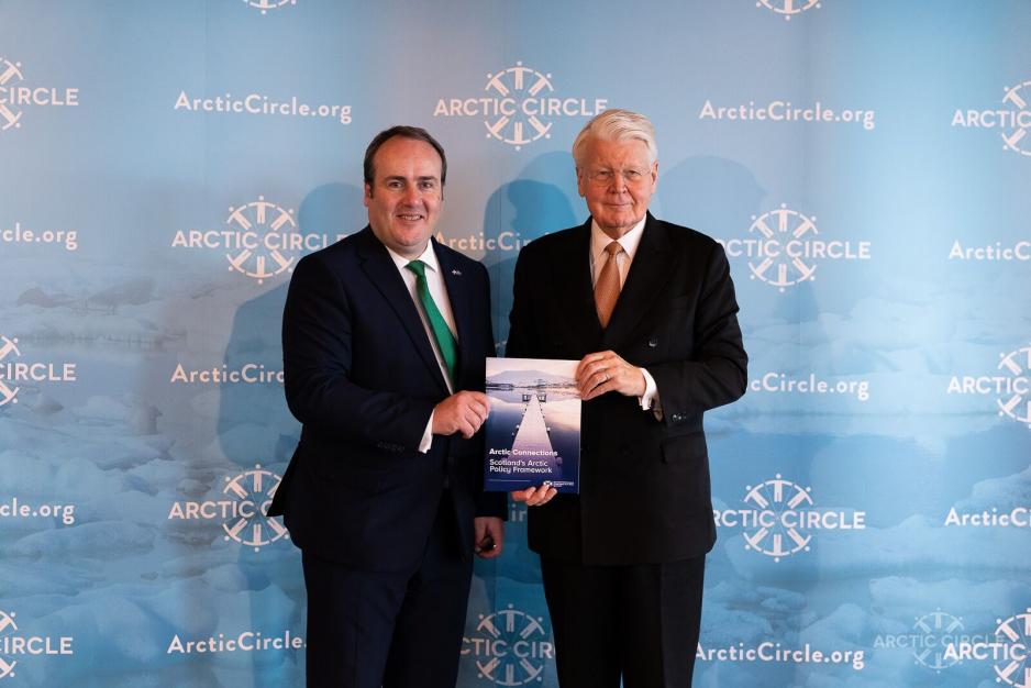 Den skotske energiministeren, Paul Wheelhouse, sammen med den tidligere islandske presidenten Ólafur Ragnar Grímsson for å fremme Skottlands arktiske politikk. Foto: Arctic Circle