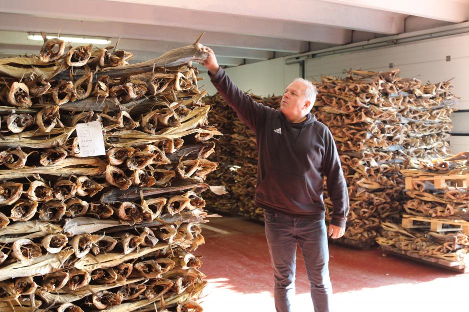 – Mange tror kanskje at fisken skal ha minst mulig nedbør når den henger på hjell, men det er faktisk bra for kvaliteten om fisken blir våt og tørker om hverandre. Den skal heller ikke få for mye frost. Milde vintre, som det er her, er gunstig, forteller styrelederen i selskapet.