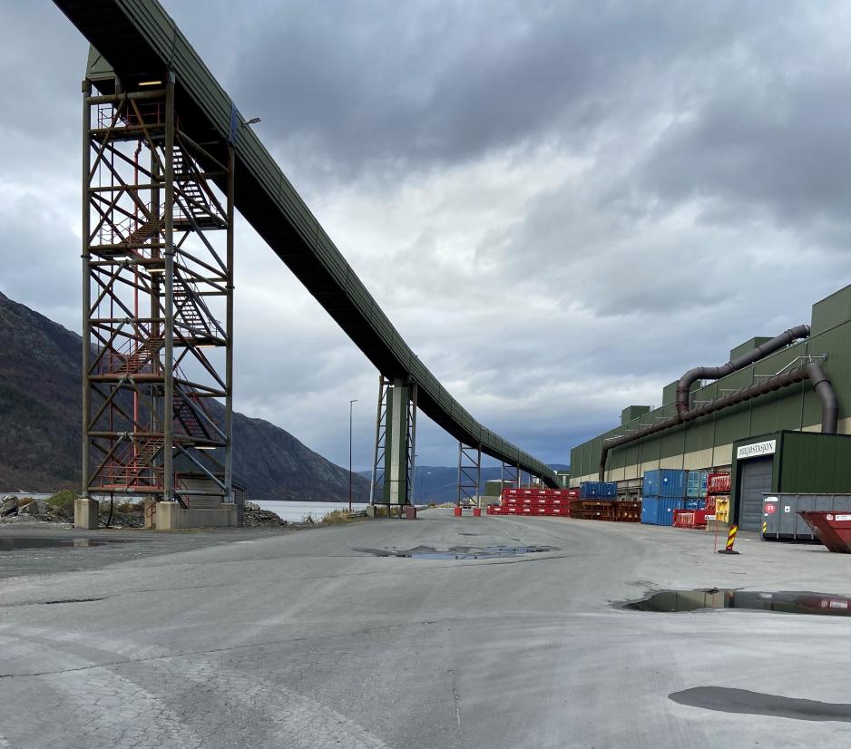Petrolkoks fraktes opp til massefabrikken på et samlebånd fra skip i Mosjøen havn. Massen settes i former på Alcoas egen anodefabrikk og bakes i 14 dager før anoden sendes til elektrolysen.