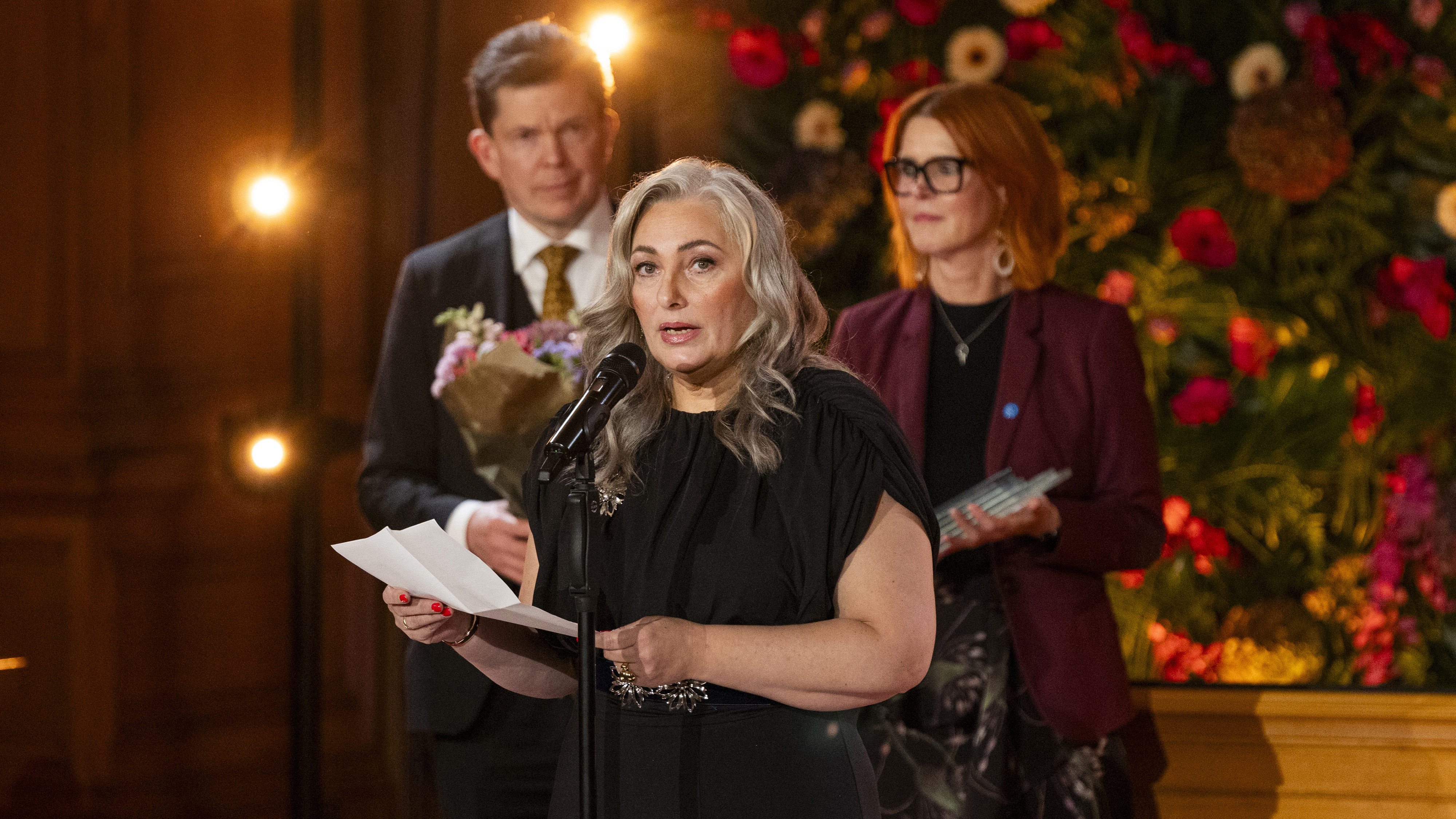 – Jeg vil takke Nordisk råd og juryen for å ha tro på at det selv med et lite språk kan skrives stor og viktig litteratur. Mitt håp er at denne prisen kan bidra til å kaste mer lys over litteraturen som blir skrevet på Færøyene i dag, sier den prisvinnende forfatteren Vónbjørt Vang. (Foto: Melker Dahlstrand/Sveriges riksdag)