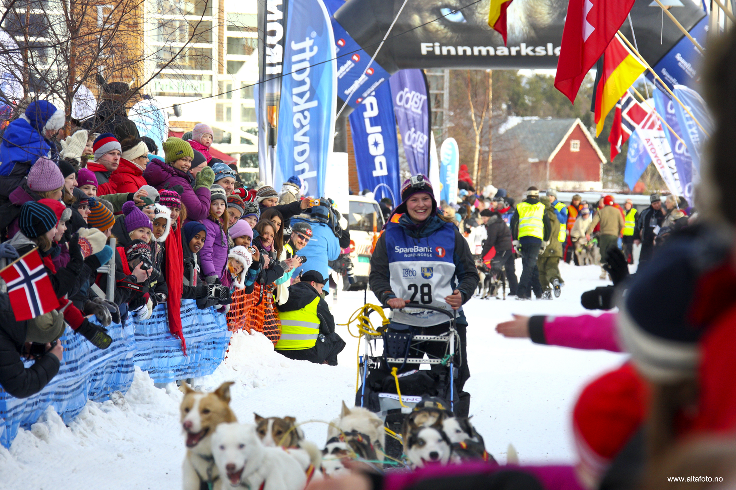 Løpet starter i Alta sentrum, med showstart for hundekjørerne i 1000 kilometers-klassen. Folkefesten akkompagneres både av speaker og musikk, og trekker tusenvis av publikummere: