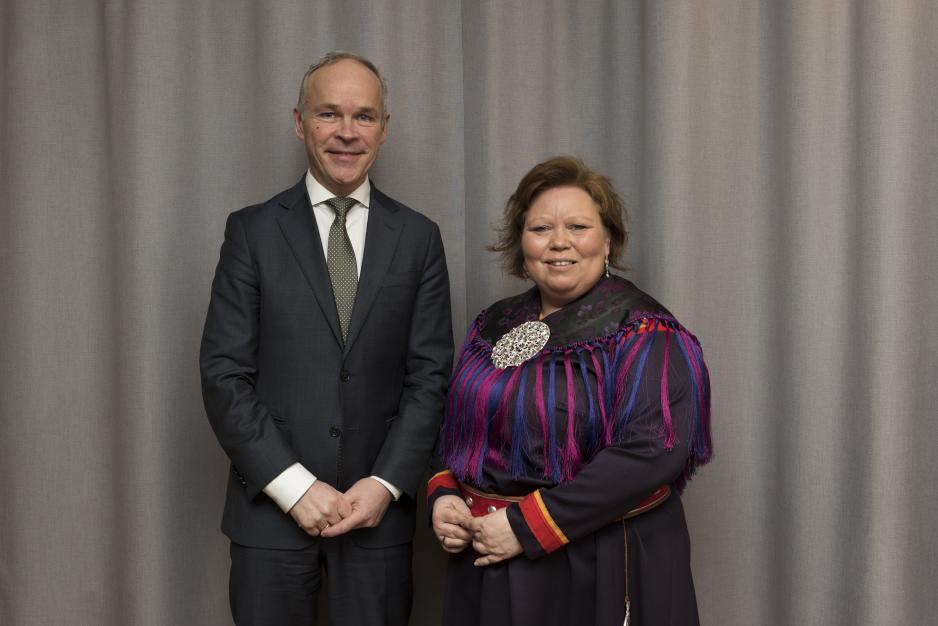 Kommunal- og moderniseringsminister Jan Tore Sanner og Sametingets president Vibeke Larsen er tilfreds med at forslaget om en felles nordisk samekonvensjon nå er klart. (Foto: KMD/Regjeringen)