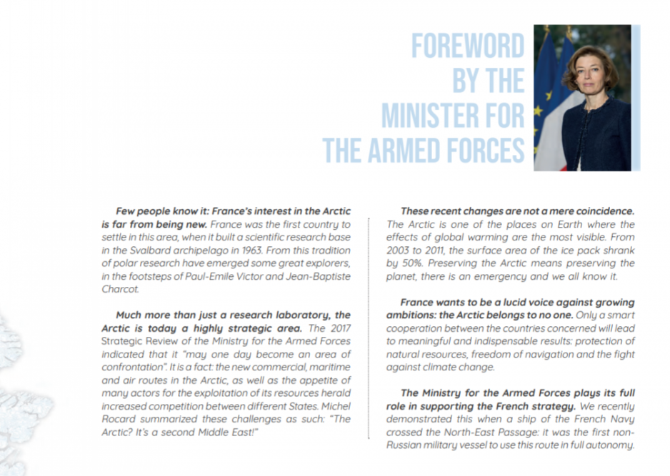De oppsiktsvekkende uttalelensene finner vi i forordet til France and the new strategic challenges in the Arctic, den nye franske Arktis-strategien, signert Florence Parly, forsvarsminister i Frankrike.