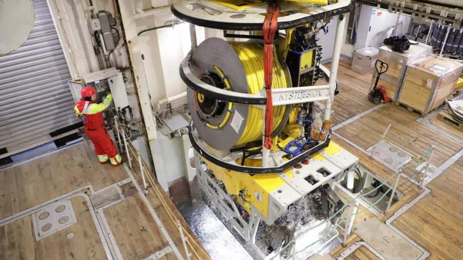 Vann fosser fra ROVen når den heises opp etter et vellykket dykk. (Foto: GoNorth)