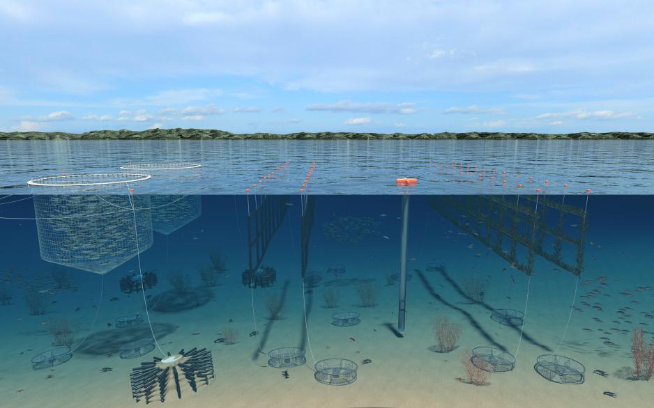 Framtiden ligger i havet sier mange, og integrert havbruk, flere arter på samme lokalitet, kan bli et vanlig syn langs kysten. (Illustrasjon: Bellona)