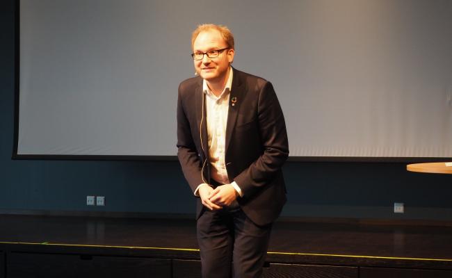 Daniel Bjarmann-Simonsen ga uttrykk for at vindkraft er en viktig del av det grønne skiftet i sin tale på Nord i Sør. Foto: Nord i Sør