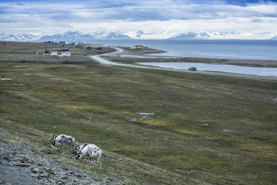 Reinsdyr beiter nær Longyearbyen på Svalbard. Stadig mildere vintrer gjør livet tøft for svalbardrein på tundraen. Regn blir til is på bakken og hindrer reinsdyrene fra å skaffe mat. Foto: Siri Uldal, Norsk polarinstitutt