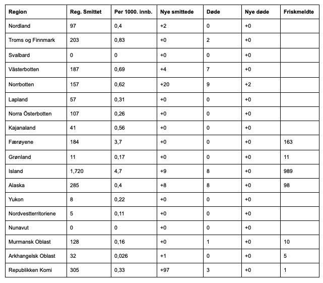 Totalt antall bekreftede tilfeller av Covid-19 i nordområdene