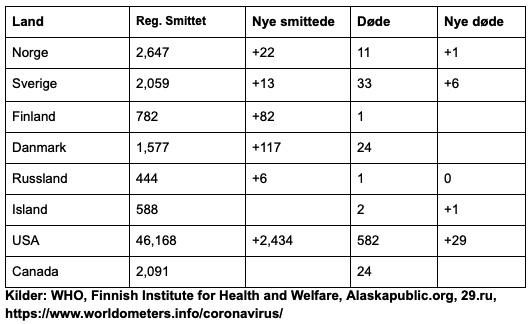 Totalt antall bekreftede tilfeller av coronasmitte i land som er medlem av Arktisk råd