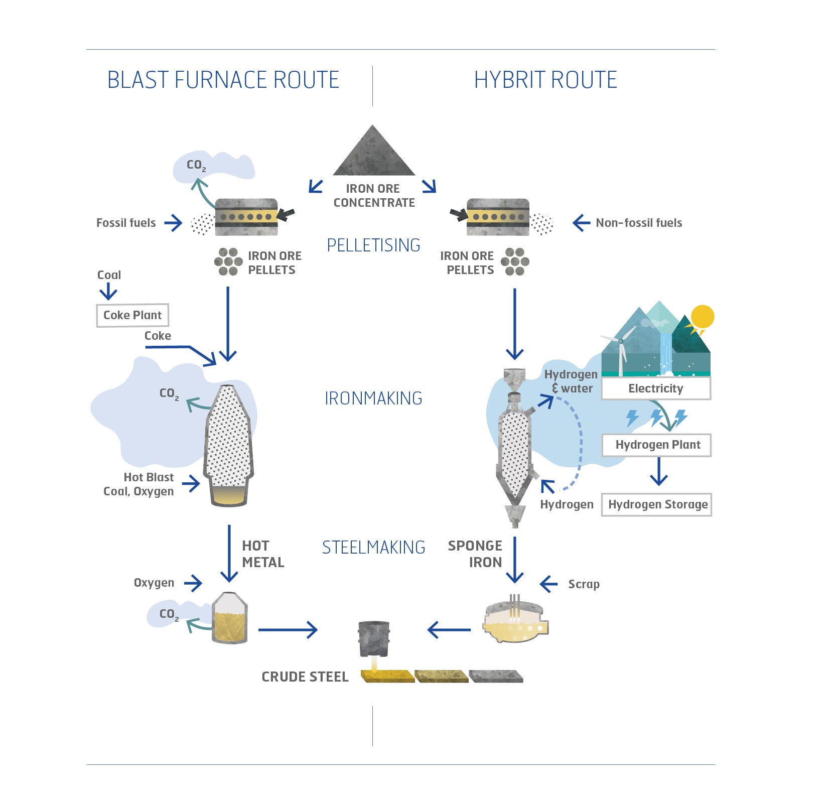 Tradisjonell stålproduksjon bruker kull eller koks som reduksjonsmiddel i prosessen, noe som igjen fører til store CO²-utslipp. Den nye teknologien som er utviklet kalles Hybrit, og i denne prosessen er det hydrogen som tilsettes, noe som fører til utslipp av H²O, også kjent som vann.