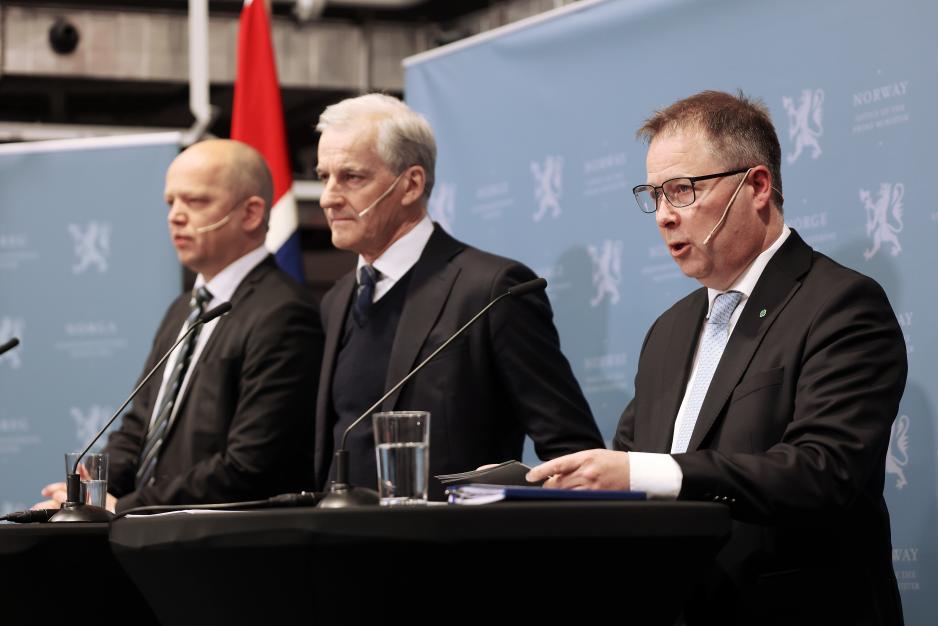 – Sikkerhetspolitiske og demografiske utviklingstrekk øker betydningen av bosetting og aktivitet i landsdelen, står det i langtidsplanen for Forsvaret rundt nye FoU-grepet i nord. Her presenteres den av forsvarsminister Gram (t.h.), statsminister Jonas Gahr Støre (Ap) og finansminister Trygve Slagsvold Vedum (Sp) på fredag. (Foto: Torbjørn Kjosvold/Forsvaret)