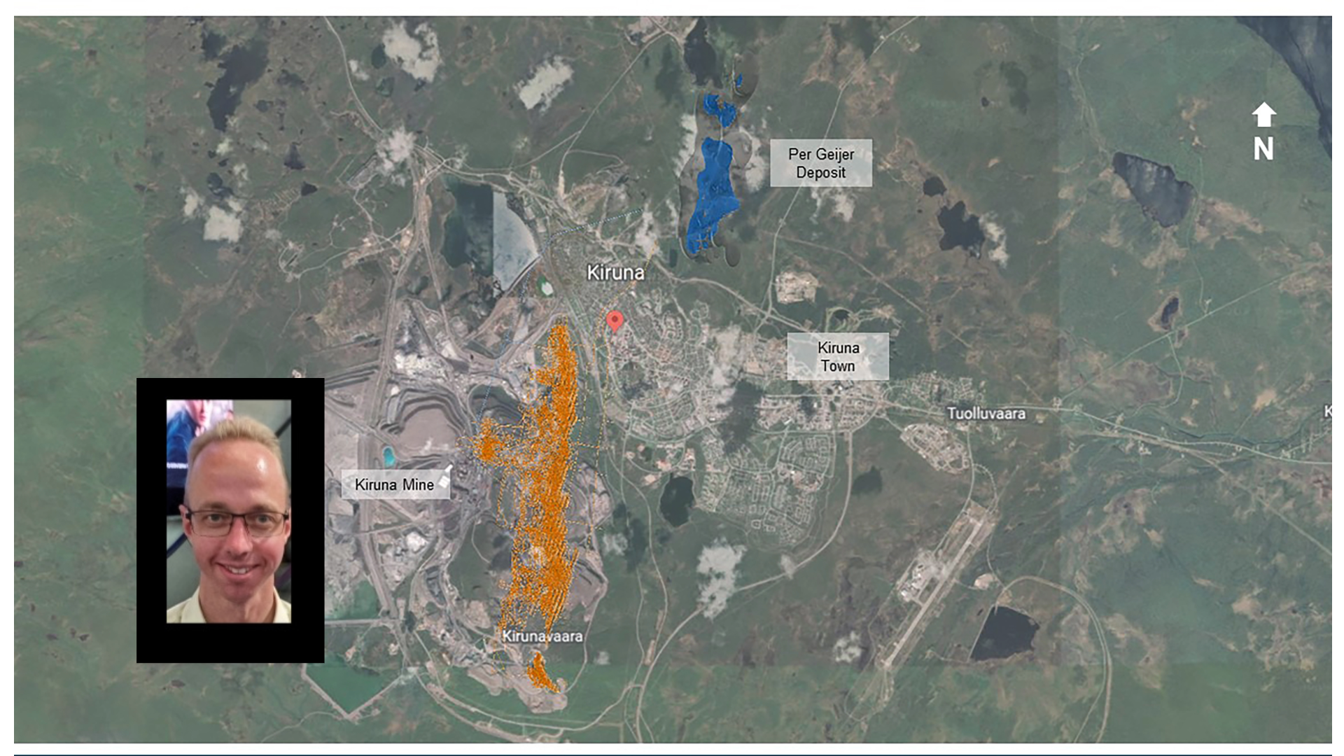 Illustrasjon over Per Geijer forekomstene som viser beliggenheten i forhold til Kirunagruven og byen Kiruna. (Foto: LKAB).