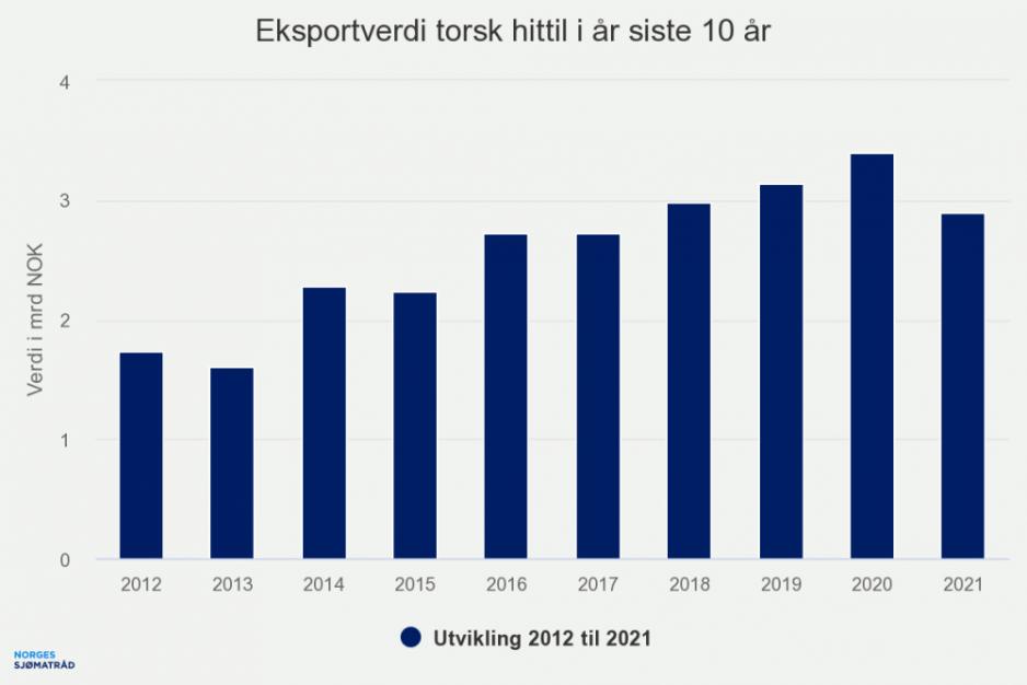 Samtidig meldes det at eksportverdien av fryst torsk i mars var den høyeste noensinne i en enkeltmåned. Sjømatrådet så økt eksport av fryst torsk til Europa i første kvartal.